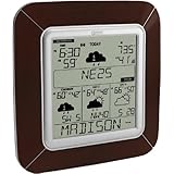 The chocolate-framed display stands alone, or wall hangs. The top LCD section displays the time, the indoor temperature, and the current day\'s forecast, conveyed with the projected high and low temperatures and sky condition icon. On the second LCD tier, rain, wind, sun, and pressure information toggle, while the third tier reveals forecast icons and high/low temperatures for the next three days. Forecasts update every six hours. The location, location forecast, sunrise/sunset times, and outdoor temperature scroll across the bottom display section. On the back of the display, five function keys enable LCD contrast and scrolling-speed adjustments, Fahrenheit/Celsius selection, alarm setting, five-minute snooze activation, and viewing micro forecasts for morning, afternoon, evening, and night. The gateway and remote sensor both communicate with the display from 330 feet unobstructed, and come with mounting hardware. For forecast operation, no additional software or Wi-Fi connection is required. However, the system does necessitate high-speed internet service, a network router, and the separate purchase of two C and two AA batteries. A limited one-year warranty covers the forecaster.
